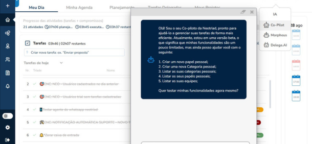 Copilot: permite usar linguagem natural para criar tarefas, compromissos, categorias e organizar o ambiente de trabalho conforme a Tríade, de forma mais ágil e intuitiva.